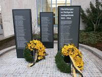 Auf dem kleinen Vorplatz bei den heutigen Justizgebäuden wurden drei Stelen errichtet. Auf Ihnen werden die Namen der Opfer genannt. 423 Menschen wurden zwischen 1933 und 1944 hingerichtet. Der Ausstellungsteil im Gebäude erinnert an die jüdischen Juristinnen und Juristen aus dem Landgerichtsbezirk Stuttgart, die ermordet oder in die Emigration getrieben wurden.